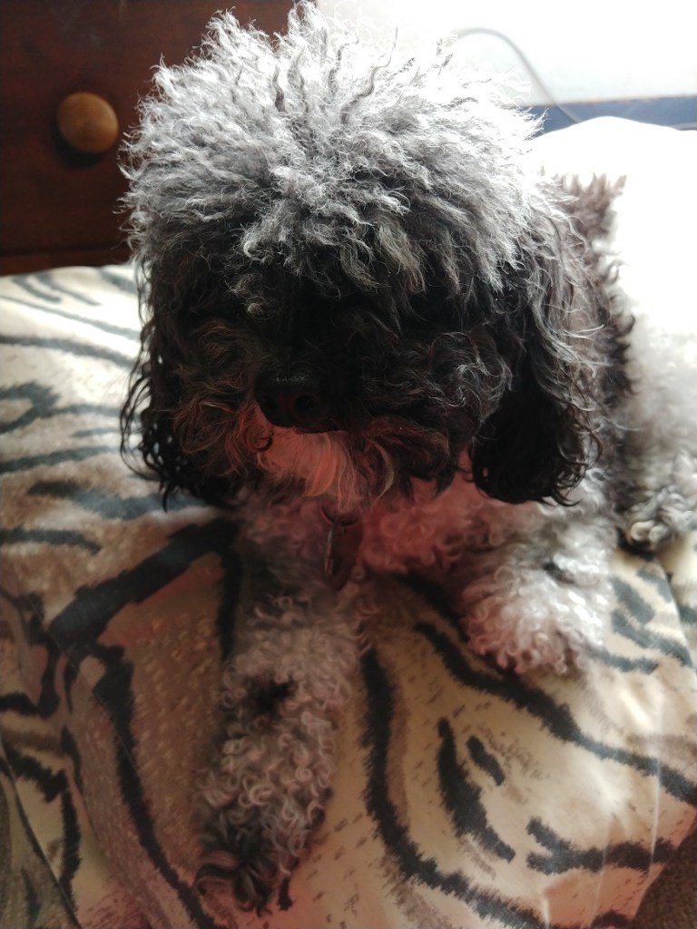 Good Afternoon. It is I Gigi the parti poodle here to entertain you with another chapter of my story. My novelist has requested I tell you that the fifth and final book in her Musicology series Musicology: The Epiquad will be releasing in June 2021. I will provide more information about that next week. Tomorrow is a dark day for I will be voyaging to the groomers. I dread it vehemently. Although I feel better afterwards the experience is nothing short of horrific. But as I have come to resemble Sam Sheepdog from the Looney Tunes cartoons, I must accept my grooming as a necessity and carry on. Here is a before photograph of my current state: