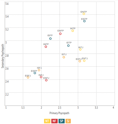 As you can see the personality types which are more likely to have ASPD and psychopathy are more to the right and the ones who are less likely to have psychopathy are to the left. Knowing that psychopaths are always extroverted we can eliminate the INTP, INTJ, ISTJ and the ISTP from the equation leaving the ENTP the ESTP the ENTJ and the ESTJ. Also, all the types that are F or feeling personality types are on the left and the T or thinking personality types are all on the right.