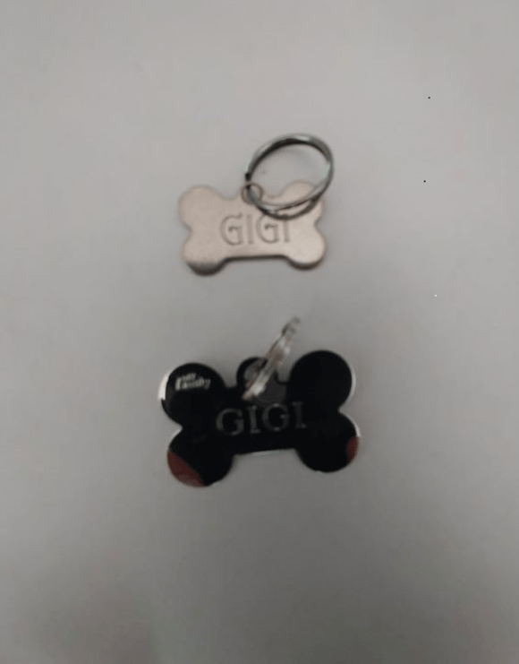 Good afternoon. It is I Gigi the parti poodle here to introduce chapter six of my story Catzilla. This Tuesday, the thirtieth of May, I celebrated my birthday. Everyone sang Happy Birthday, drank Aquadent and had a lovely time. I did not, however, receive a diamond studded dog collar. Naturally, this was a great disappointment to me. Nonetheless, I was given a darling piece of jewelry: a new name tag. It is larger than my older one and in the same Garamond font as you can see in the picture below: